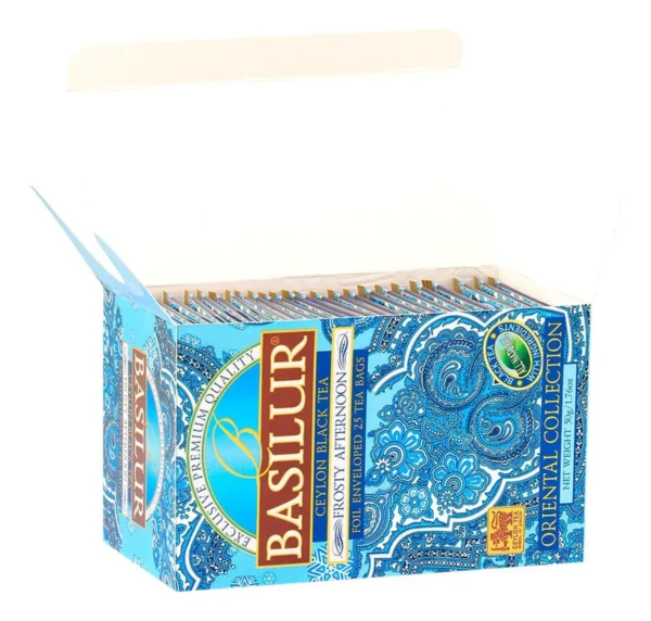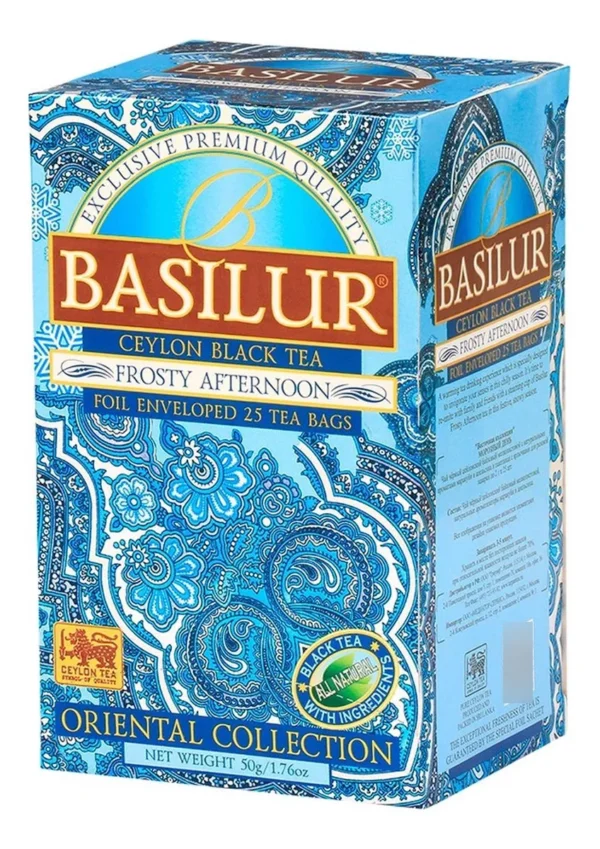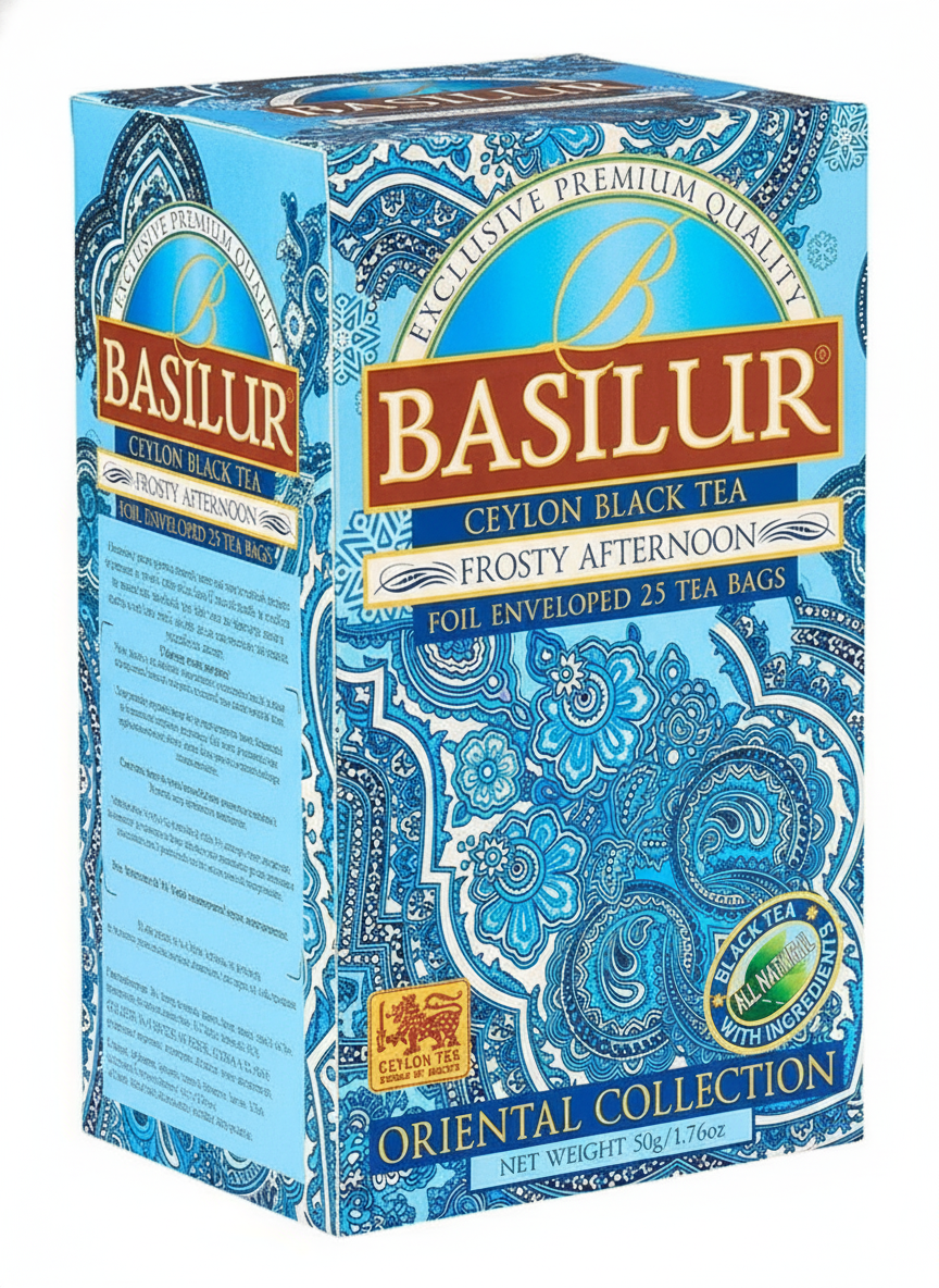 Perfecto para acompañar postres, leer un libro o disfrutar de una pausa relajante, Basilur Frosty Afternoon combina tradición, elegancia y el inconfundible carácter del auténtico té de Ceilán.